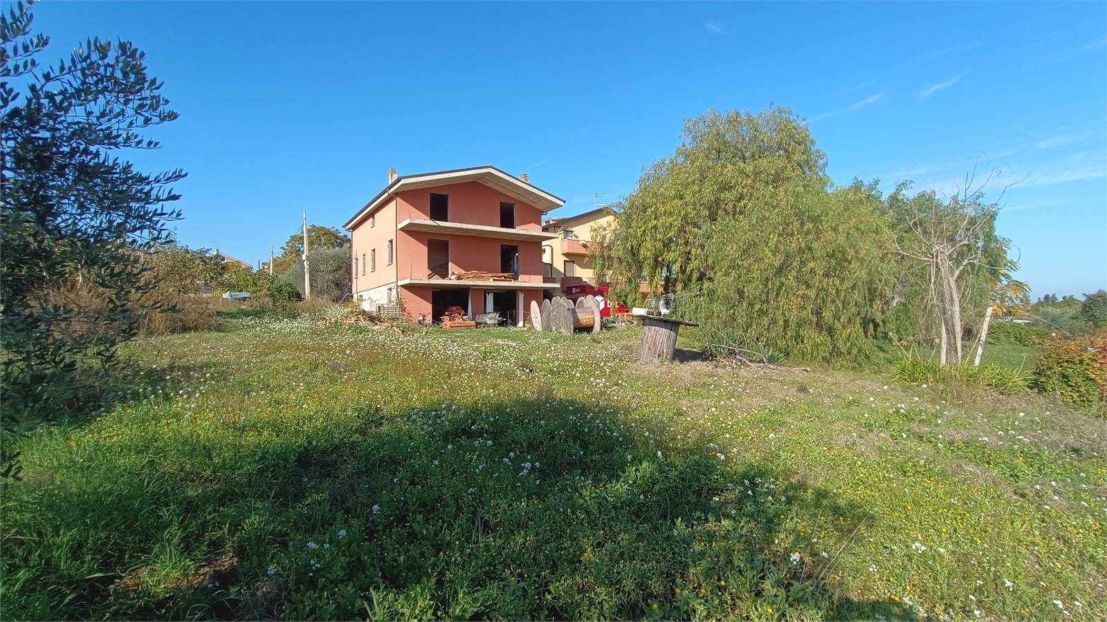 Città Sant'Angelo, Viale San Martino, in a convenient area just steps from the Outlet Village and the Iper Shopping Center, with excellent exposure and panoramic views, we offer for sale a building in its unfinished state, with infill walls, insulation, and exterior finishes completed. The property has independent access and consists of two apartments on the ground and first floors, as well as a basement with a garage and storage rooms. Surrounding land measures approximately 900-1000 square meters.
